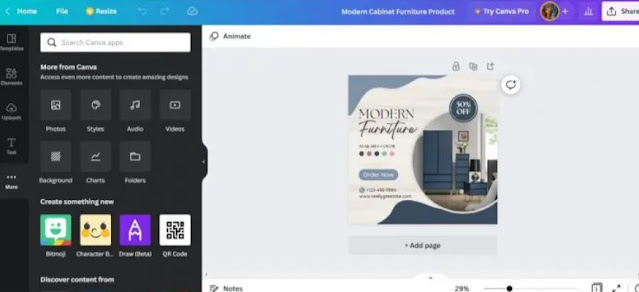 يتيح لك الموقع إنشاء تصميمات وعروض تقديمية ورسوم بيانية والمزيد.